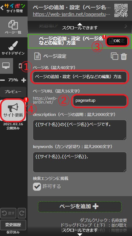 ④左中央の「サイト更新」ボタンをクリックして変更を更新します。